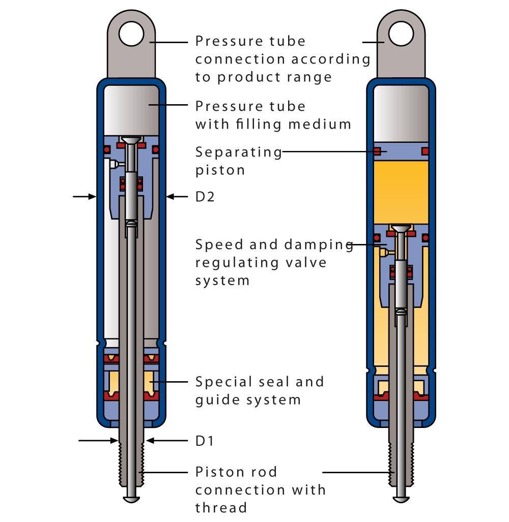 A special piston / valve system, which separates the two pressure chambers in the spring, allows effortless variable locking. If the valve tappet is released from the outside and the exchange between the pressure chambers is interrupted, the gas spring will lock and hold even heavy loads reliably in the desired position. With the valve open, the linear spring characteristic curve of the BLOC-O-LIFT locking gas springs will provide an even increase in force over the entire range of motion.