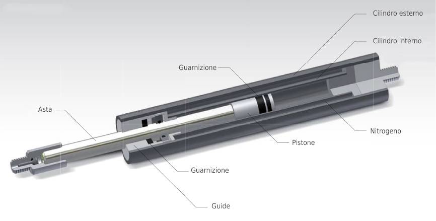 Tension springs work in the opposite way to gas springs. The gas pressure in the cylinder pulls the piston rod towards the inside. The spring force F1 results from the internal pressure in the cylinder, which is generated by the filling medium nitrogen. In the tension spring, the piston ring area between the piston rod and the inside cylinder diameter is decisive. When no load is applied, the piston rod is always compressed. The tension springs of series ‘Z’ have no damping. Series ZD is available with damping.